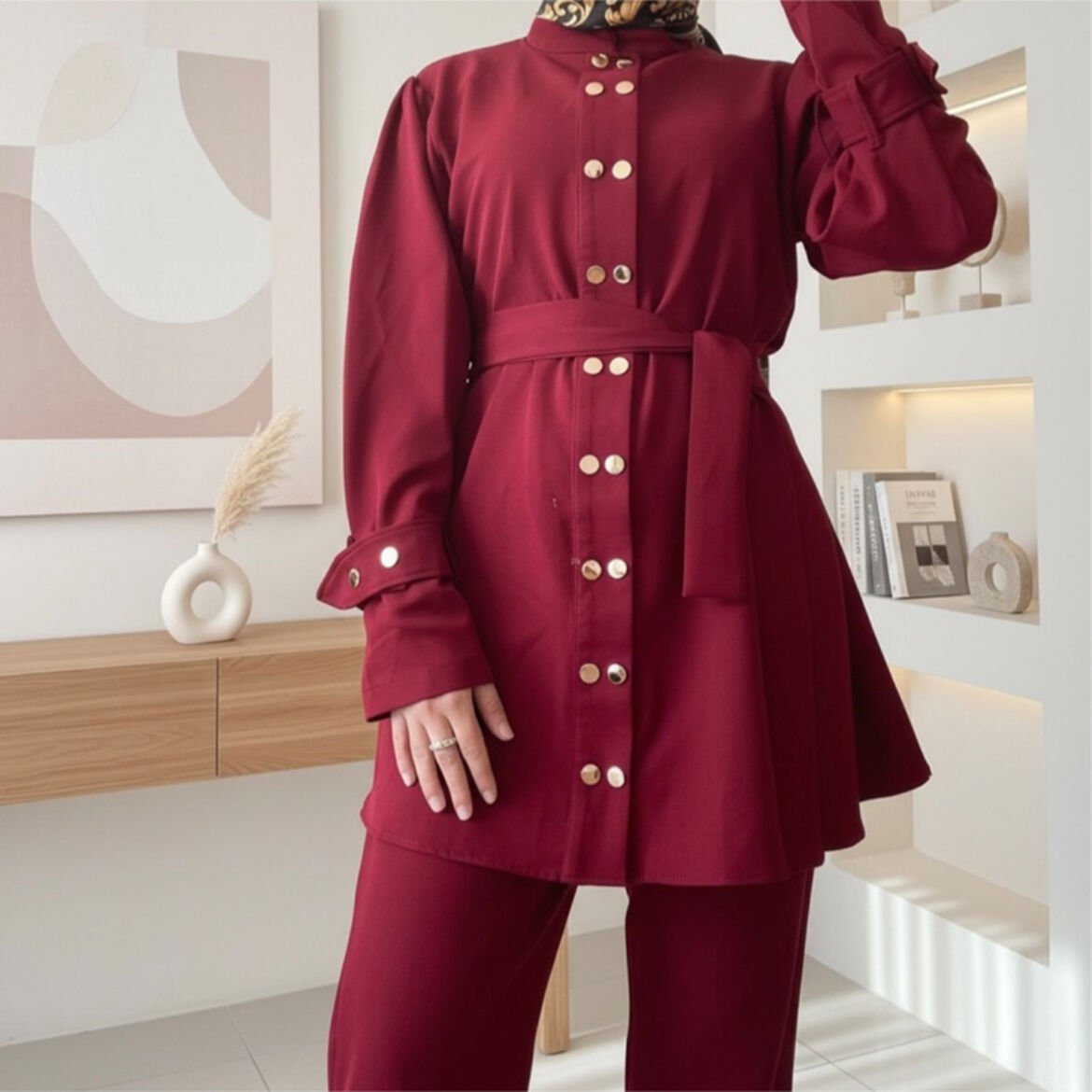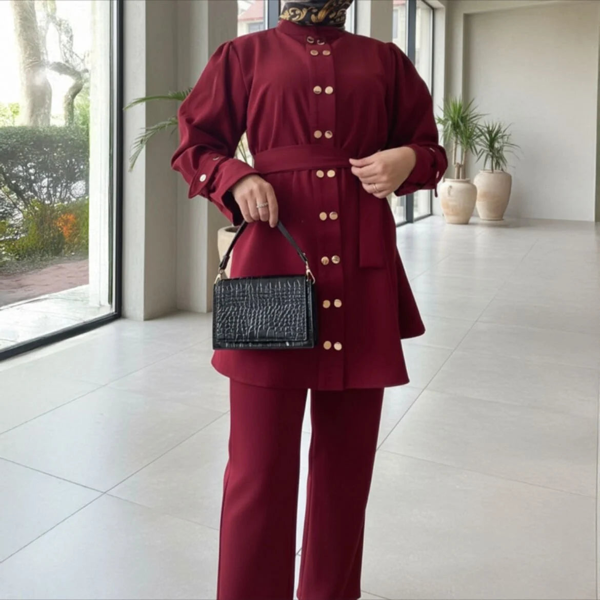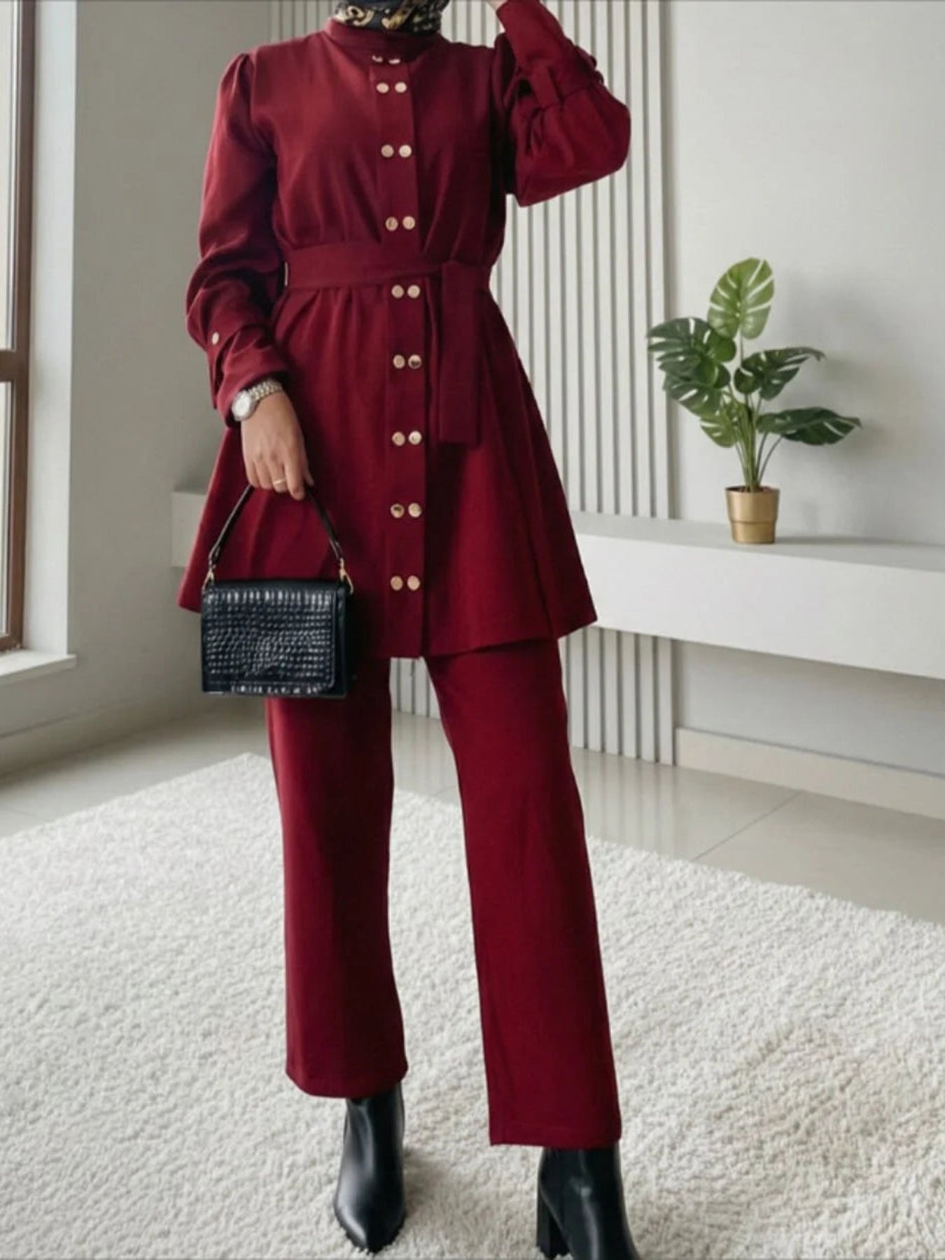 İthal double krep kumaştan üretilmiştir.Boydan boya çift çıt çıt detayı bulunmaktadır.Kollarında çift çakı düğme detayı mevcuttur.Standart bedendir 36-42 uyumludurPantolon boy 98 cmÜst boy 78 cm